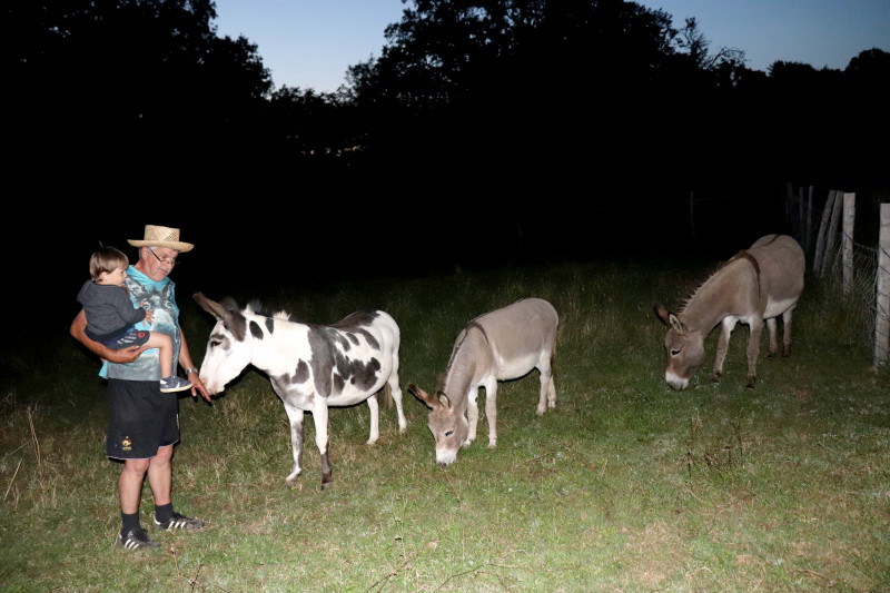 Mais où étaient donc les ânes et ânesses? Certains diront avec humour qu'il y en avait autour de la table, peut-être mais les vrais paissaient paisiblement tout au fond de leur prairie ne souhaitant pas partager leur repas avec ces bipèdes qui n'avaient même pas prévu de carottes!!! Ils ont quand même eu la visite, par intermittence, de certains invités voulant leur faire un petit coucou ... c'est le cas par exemple d'un petit garçon avec son papy qui sont allés ... de nuit ... souhaiter bonne nuit à nos amis aux grandes oreilles!